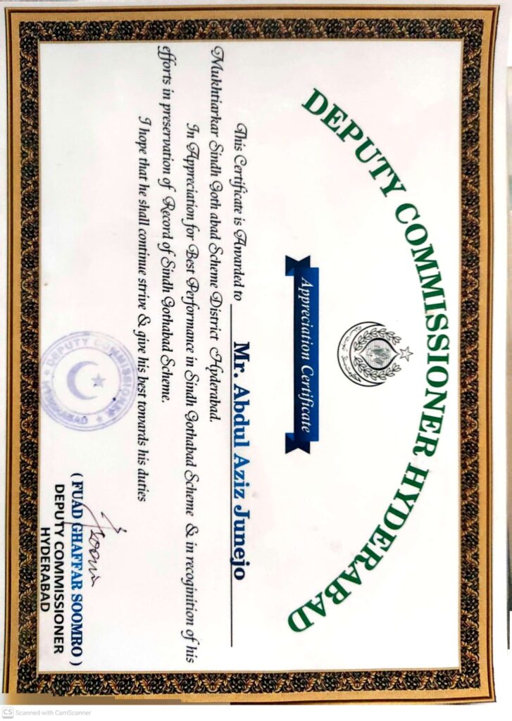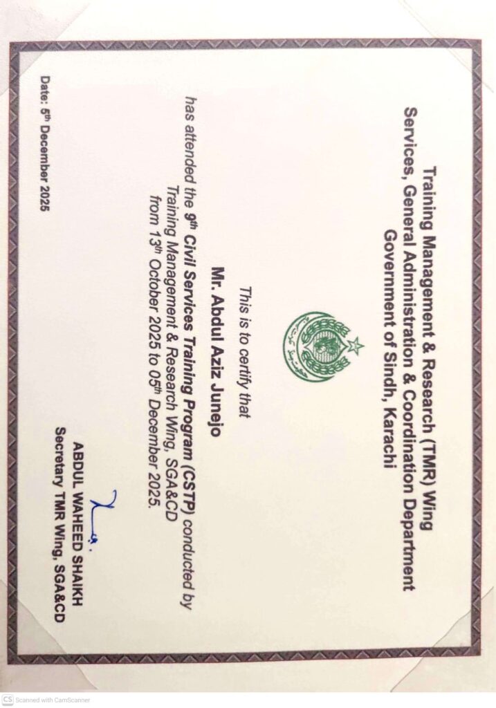Haji Abdul Aziz Junejo leads a disciplined and goal-oriented professional life as Assistant Commissioner PMS Cadre and Section Officer at the Governor’s Secretariat Karachi He focuses on revenue administration public service governance and crisis management while mentoring junior officers and promoting efficient administration