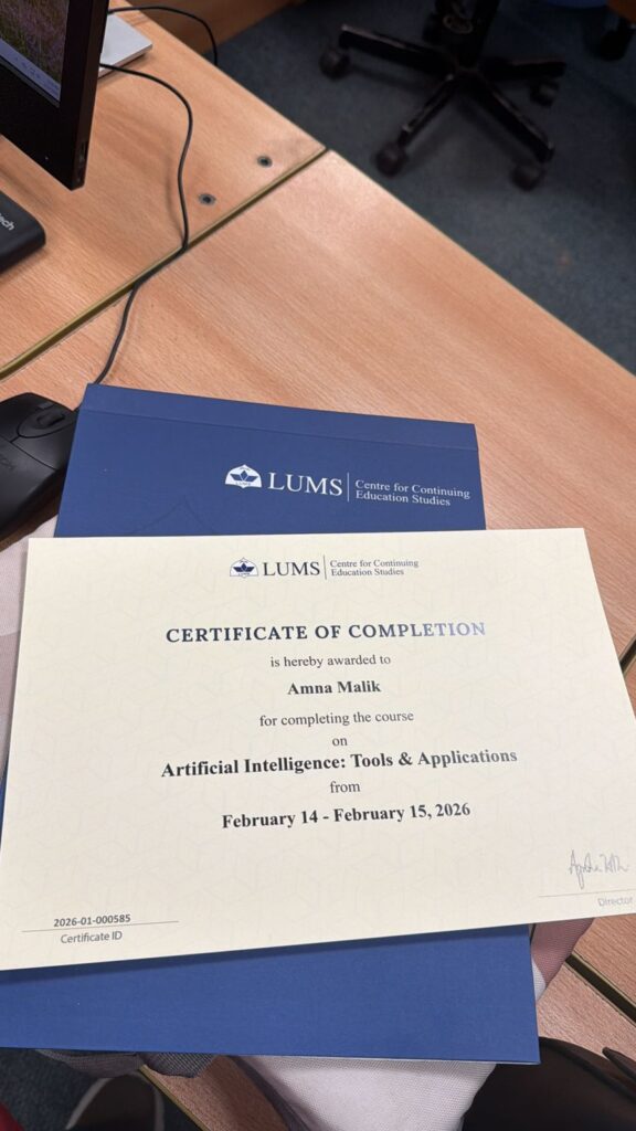 She holds certifications in Digital Marketing, Leadership & Communication (Harvard), Google & SEO, and training from LUMS.